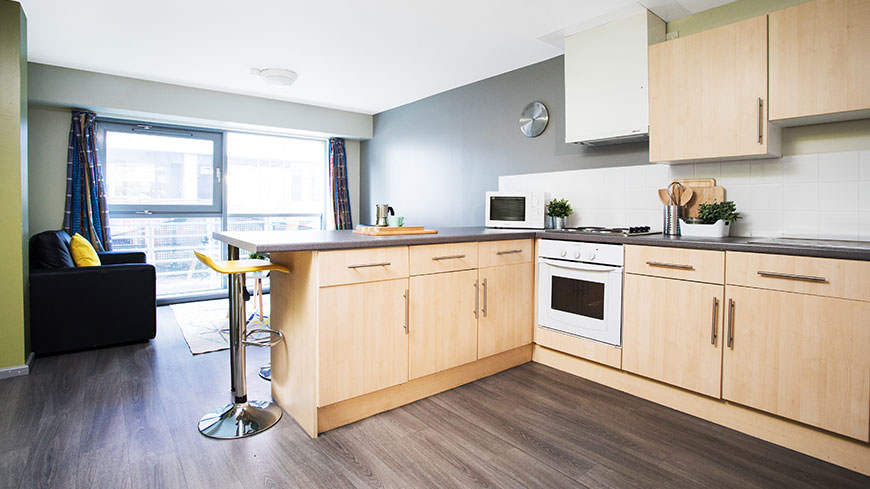 Flats have a shared kitchen with a breakfast bar and stools, as well as an area with a sofa and curtains. Kitchen facilities include a cooker, fridge, freezer, toaster, kettle & microwave. Each flat also has a vacuum cleaner, dustpan and brush, mop and bucket, iron and ironing board, and a bin.