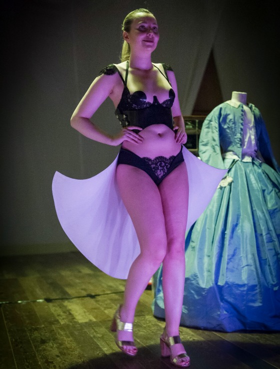 A black leather, laser-cut crinoline with printed bodysuit and a blue lace, beaded crinoline and lingerie set by current third year Contour Fashion students Louisa Haywood and Katherine Blake, were showcased to an audience of prominent photography and fashion journalists.
