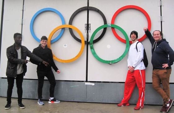 From left, David Brefo-Boateng, Leighton James and Matt Lilley lean out of the jury boxes at the Garmisch-Partenkirchen ski jump