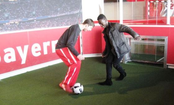 Tom Judd, left, and David Brefo-Boateng test out their football skills in the Bayern Munich museum at Allianz Arena