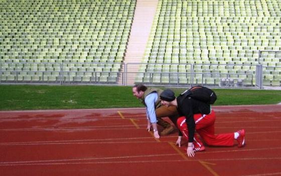 Leighton James, left, and Tom Judd line up on the athletics track at the 1972 Olympic Stadium