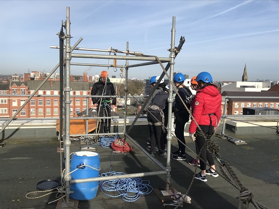 Up on the roof, they had a safety lesson from the team at Vertical Events ‘to go at their own speed’ and ‘don’t look down.’ They also got a rare glimpse of the long-range views in every direction, showing the full extent of DMU’s campus.