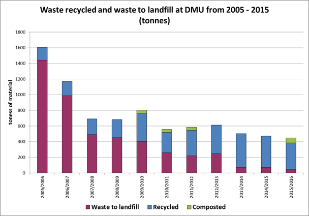 The recycling scheme has increased the amount of waste that we recycle at DMU and we have reduced the overall amount of waste that we send to landfill. The figure below shows our performance on waste and recycling over the past few years. We will continue to take steps to reduce the amount of waste we produce, increase the amount of recycling and reduce the carbon emissions associated with these actions.