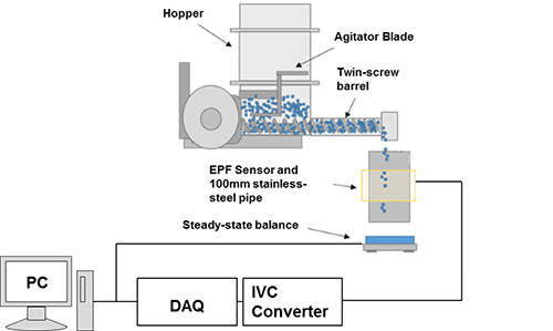 In a screw feeder, powder becomes entrained to the rotation of the screws (Fig. 1), which results in a pulsatile delivery under a lean phase flow regime. In this system (Fig. 2), the EPF sensor is used to measure the electrostatic flow ‘noise’ of powder deposited by a volumetric twin-screw feeder, and an electronic balance is used to measure the mass flow.