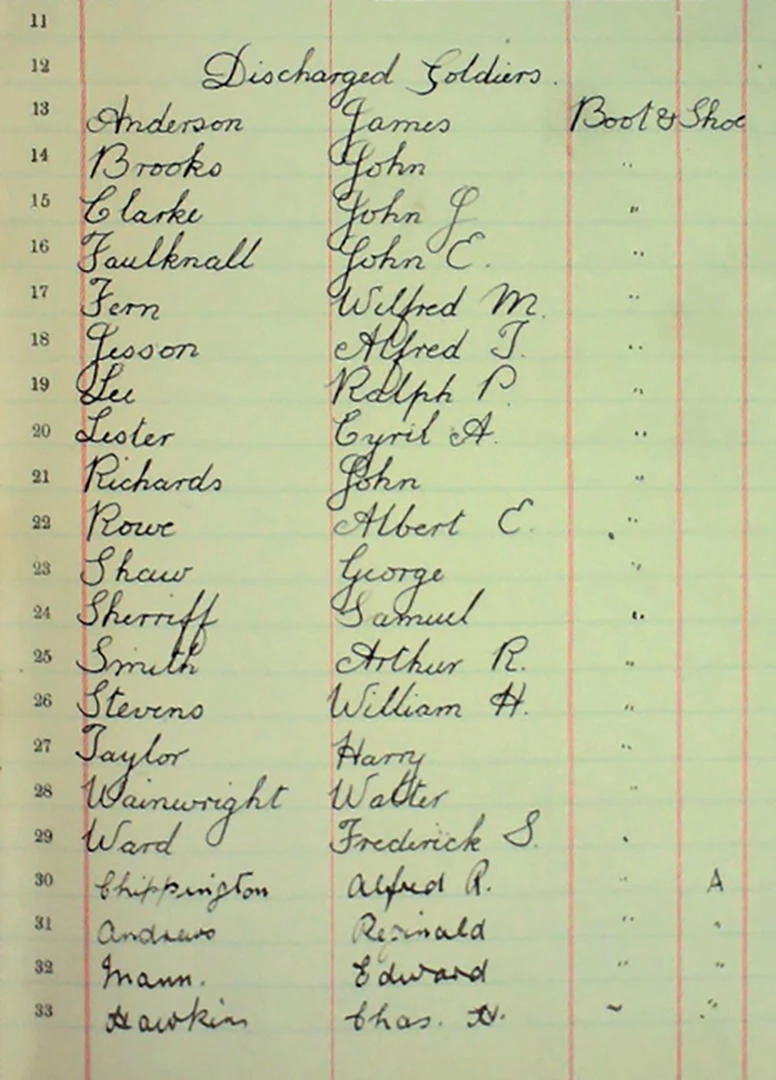 From 1916 application were received from disabled ex-servicemen who needed to learn a new trade to accommodate their injuries. By October 1917 special classes were established at the Technical School specifically for the disabled. Hand Sewn Boot and Shoe Manufacture was the most popular, although printing, watch repair cabinet making and carpentry were also offered. At the Art School men took lithography, draughtsmanship, jewellery making and illustrating.
