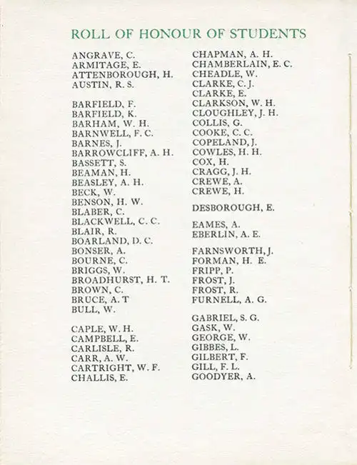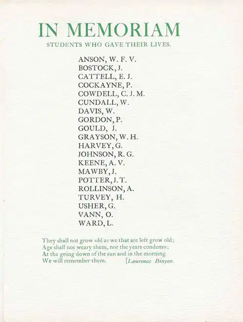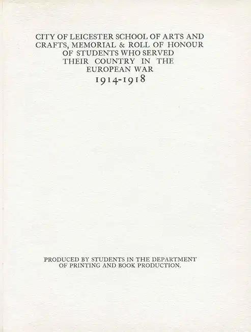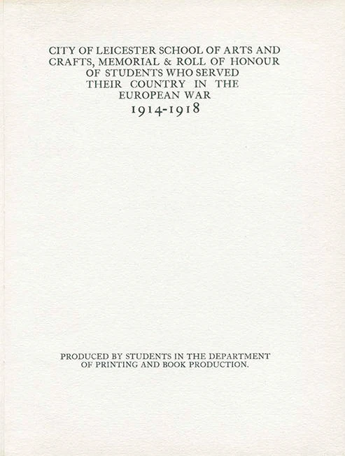 A treasure of the De Montfort University Archive is the Roll of Honour listing 177 staff and students who served during the First World War, including 20 students who lost their lives. The Roll only lists men from the Art School; we have no corresponding list of men from the Technical School who served. The Roll of Honour was made by arts students as an exercise in, printing and design that would commemorate the sacrifice of their classmates.