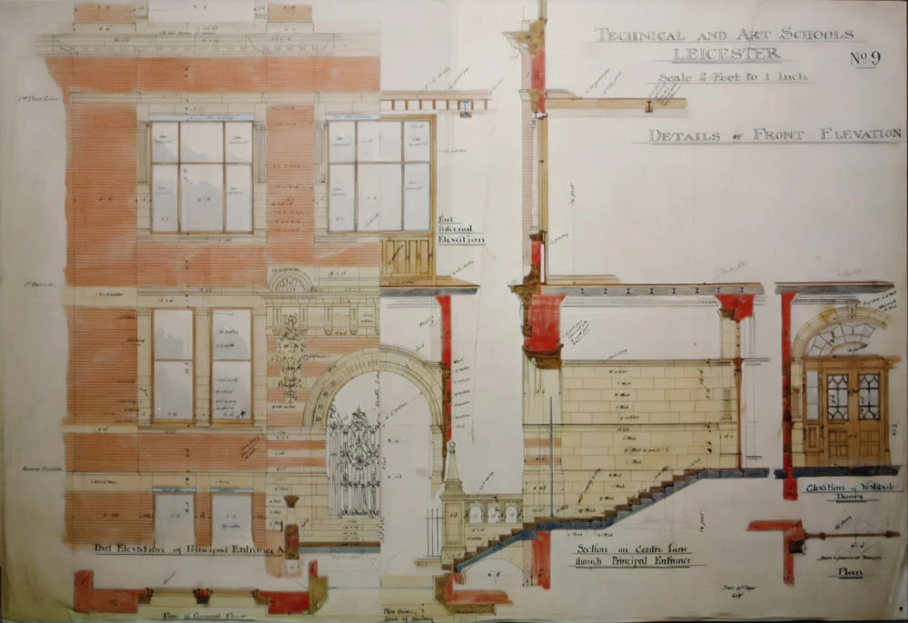 The Hawthorn Building was the first structure specifically created for DMU’s predecessor, the Leicester Municipal Technical and Art School. Founded in 1897, it was the only building used by the School until the 1960s. Constructed from orange Leicester brick with Portland stone window surrounds, the original building comprised of one long wing with a grand central entrance (today this part faces the Hugh Aston building). The architects were a local firm, Everard and Pick. Samuel Perkins Pick was both an alumnus and teacher at the Art School.