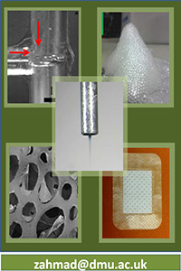 Specifically, these include various methods of drug delivery (smart nanoparticles and microparticles, bubbles, fibrous materials and transdermal/skin contact systems), tissue engineering (scaffolds and cell guidance), medical device coatings (orthopedic implants) and biomedical material synthesis (polymers and bioceramics) and fabrication (EHDA, microfluidic and emulsion methods).