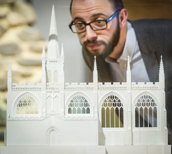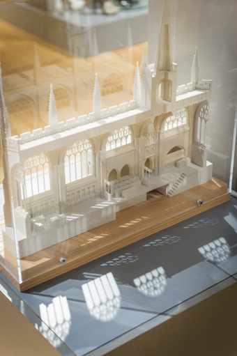 The model, displayed in a glass case at the DMU Heritage Centre, is a cross-section, allowing visitors to examine both the exterior and interior of the church and seeing for themselves how the arches also on display inside the centre, might have fit in context within the building.