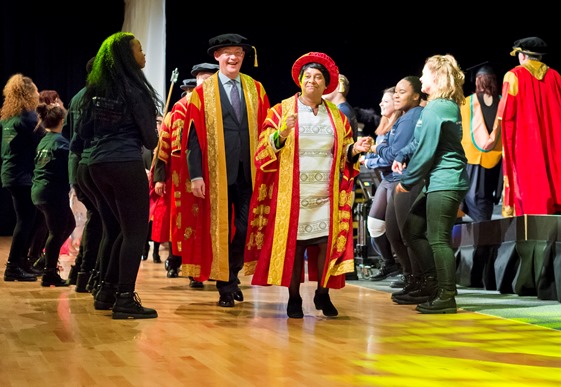 Baroness Doreen Lawrence of Clarendon led staff and students in a joyful dance at the close of a spectacular event to mark her investiture as the new Chancellor of De Montfort University Leicester (DMU).