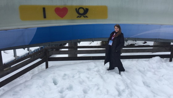 Dr Heather Dichter standing in the kreisel – a turn on the bobsleigh track
