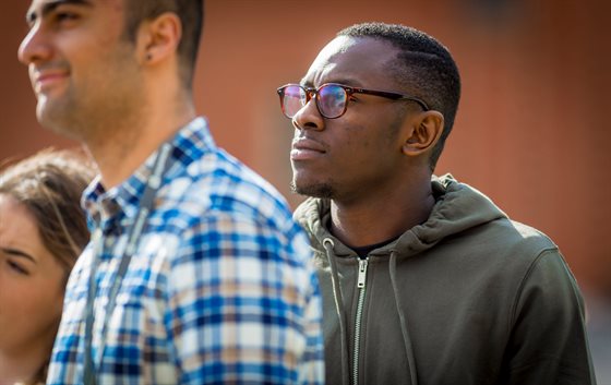 Derrick watches on at May's Be the Change event outside the Vijay Patel Building.