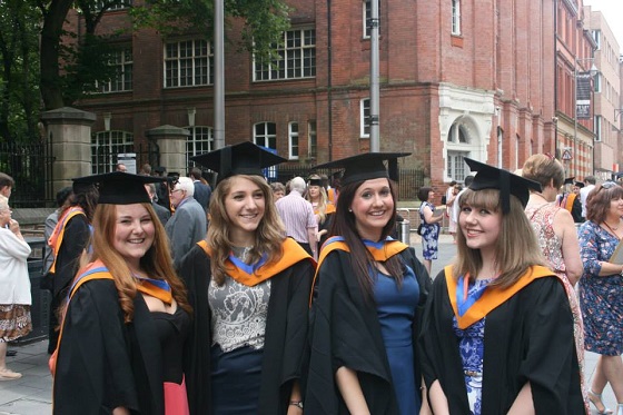 Sarah, second left, graduates in Drama with friends at DMU