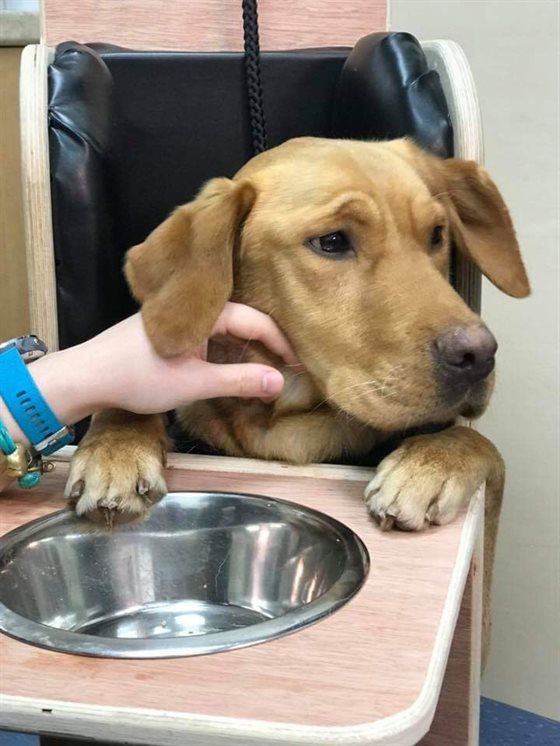 Happily, Buck has not regurgitated since using the chair and his carers have put him on a high calorie puppy food diet to help him put on weight and gain strength in the days and weeks to come.