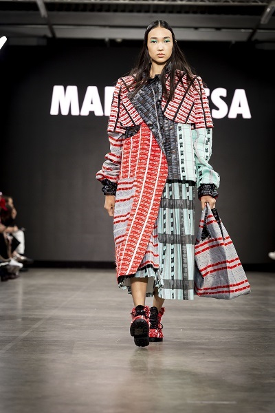 Mariah repurposed labels thrown away in the fast fashion industry to create her garments. Sourcing labels which were either over produced or classed as rejects, she recreated them into a base fabric before turning them into stunning designs.