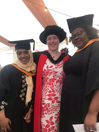 Jane Sherwood (right) celebrating with graduates at a previous ceremony