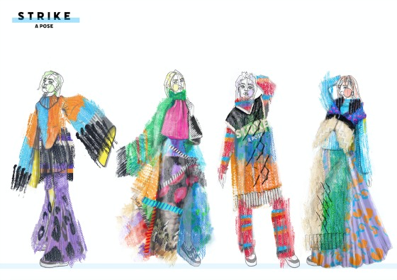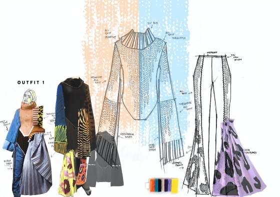 Hannah’s final collection cleverly combines clashing colours, as well as knit and woven fabrics, to create different layers and textures. It’s based on a personal connection between Hannah and her two sisters, with each sister’s personality, individual style and hobbies being the creative driver.