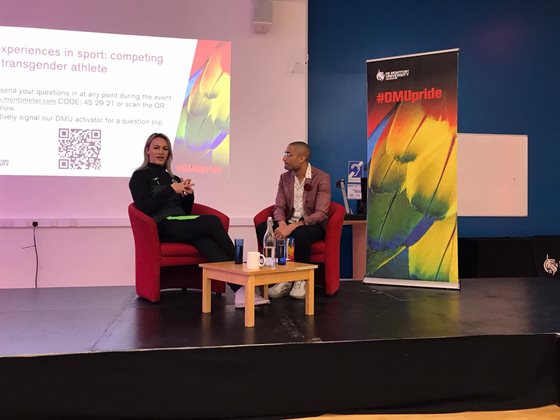 As part of #DMUPride month, BBC Radio 2 Breakfast show presenter Richie Anderson hosted a special event for staff and students at De Montfort University Leicester (DMU), where he was joined by Leicester-born footballer Chloe Quinn, as she shared her own experiences of being a transgender woman in sport.