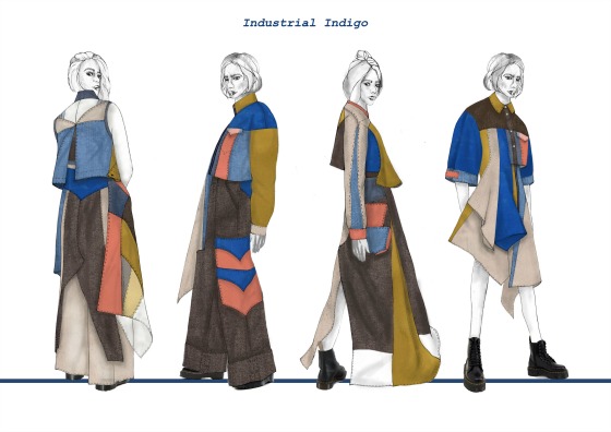 Denim and industrial influences punctuate the illustrations on show from Fashion Design graduate Ellis Whitehurst. Building on her earlier collection, her latest womenswear includes flashes of her favourite colour (pink), as well as a nod to current trends such as bleached denim.