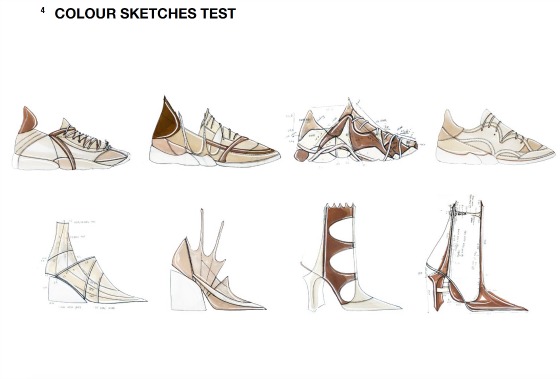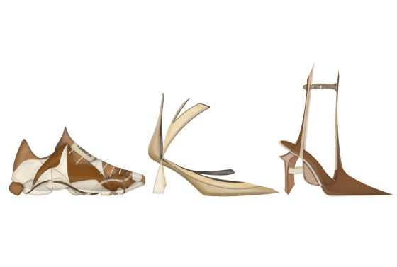 Her high heel design is modelled on the exterior of gothic architecture with sharp edges such as a pointy toe and a powerful aesthetic. Her mid-heel and trainer designs are inspired by the interior structures, mirroring arched window designs and the smooth lines of a triforium.