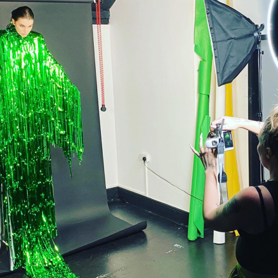 Enlisting 18-year-old daughter Tate as her model, Sallyanne dressed her in a green screen body suit and used a stapler and glue gun to attach the tinsel, which she then cut to shape. They created and shot the look at Leicester’s HQ Recording Studio, owned by Sallyanne’s partner.