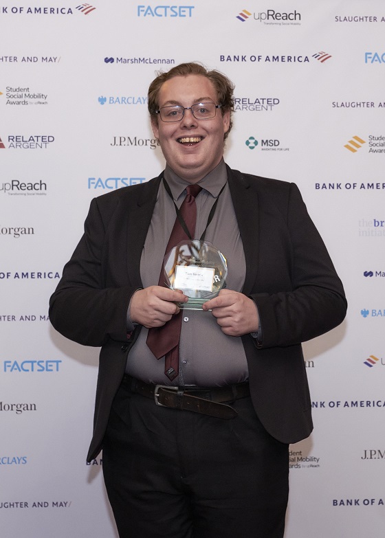 Tom, who has spent his own life negotiating his way with autism was recognised by upReach for his own personal determination and success as well as his dedication as a Liberation Officer at DMU, helping others with autism overcome barriers to succeed.