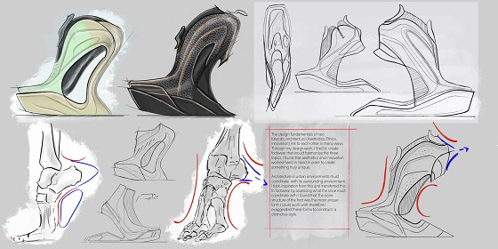 Sam’s project was called Neofuturism - influenced by the architectural movement - and he applied that school’s principals of ethics, aesthetics and innovation, to produce a men’s high heel shoe.