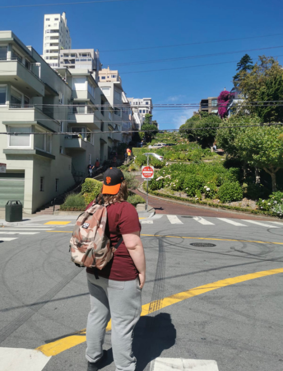 Charlotte on Lombard Street, famous for its steep, one-block section with eight hairpin turns