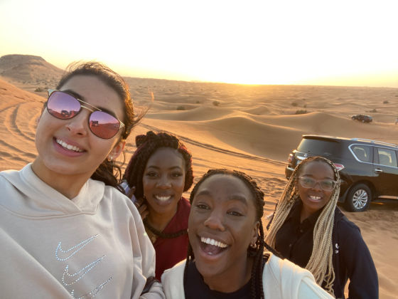 Yasmin (front left) and fellow DMU students having fun in the desert in Dubai