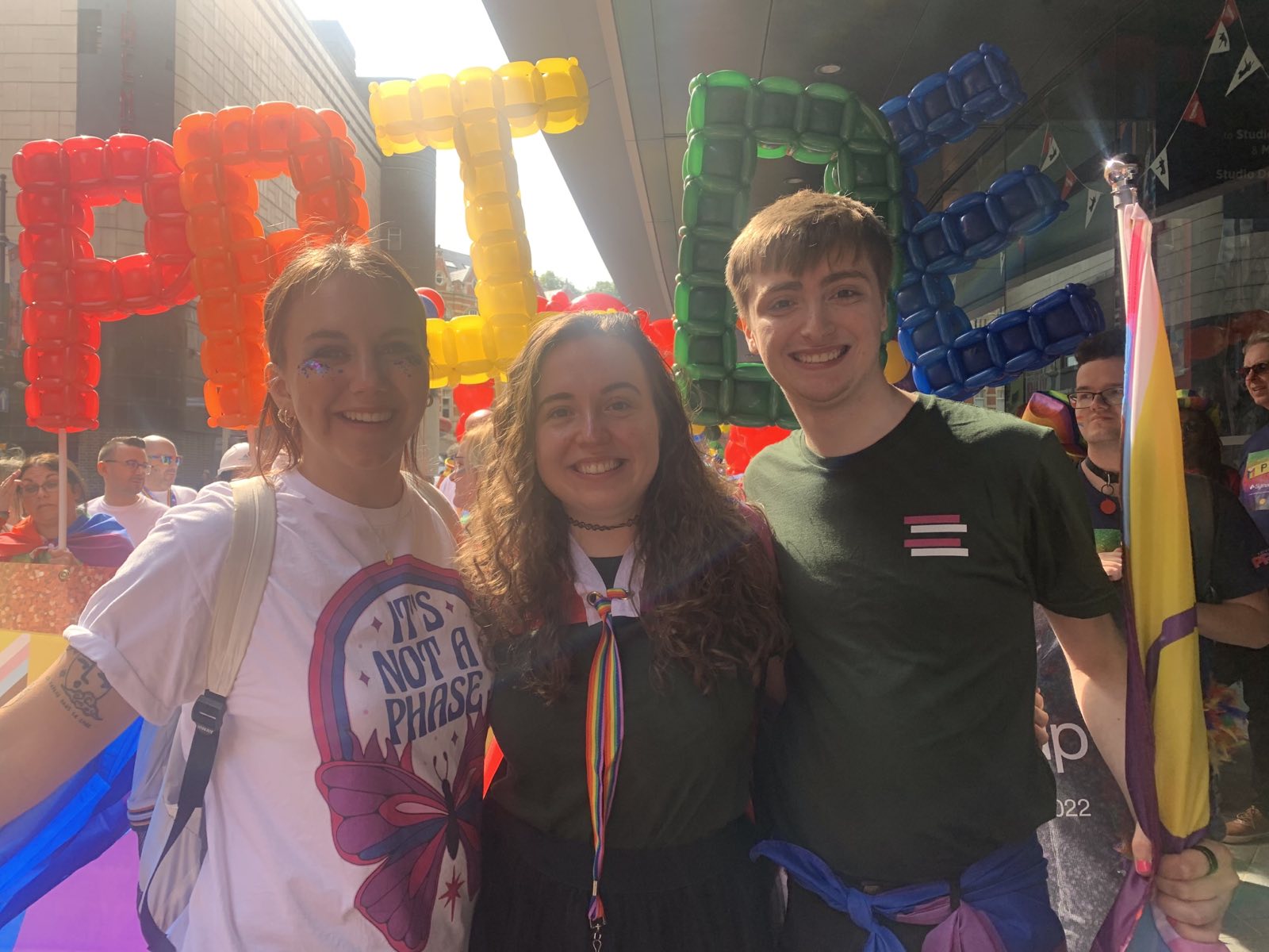 Reece (right) with their partner, Leah (middle), and friend Megan (left) at Leicester Pride