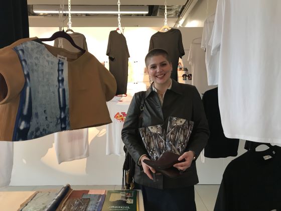 Fellow final year student Ana Del Rio Mullarkey printed designs on to a leather cropped top made from off-cuts. She did the same with a pair of leather boots found in a charity shop, promoting sustainable fashion.