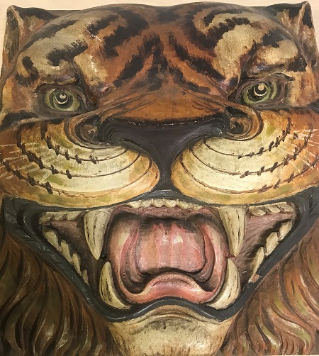 A carved wooden tiger head
