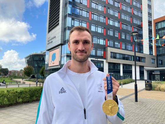 Phillip on campus with his prized Tokyo Olympics gold medal