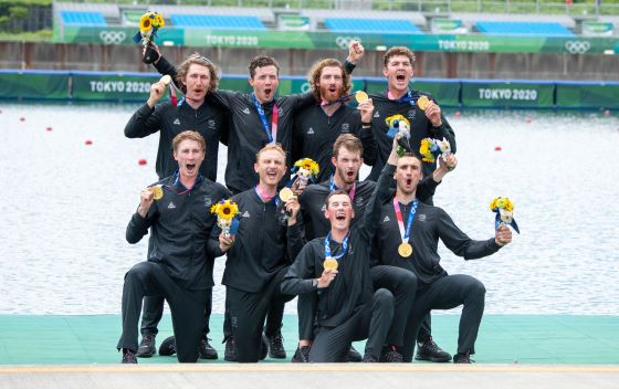 The New Zealand Eight and their cox celebrate winning Olympic gold