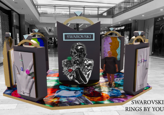Staying true to the brand, Katie designed a pop-up stand to look like a jewellery box with the rings displayed at the top. She chose a streamlined monochrome colour scheme, designed the floor to look like a jewel, and used video projections to create an immersive experience.