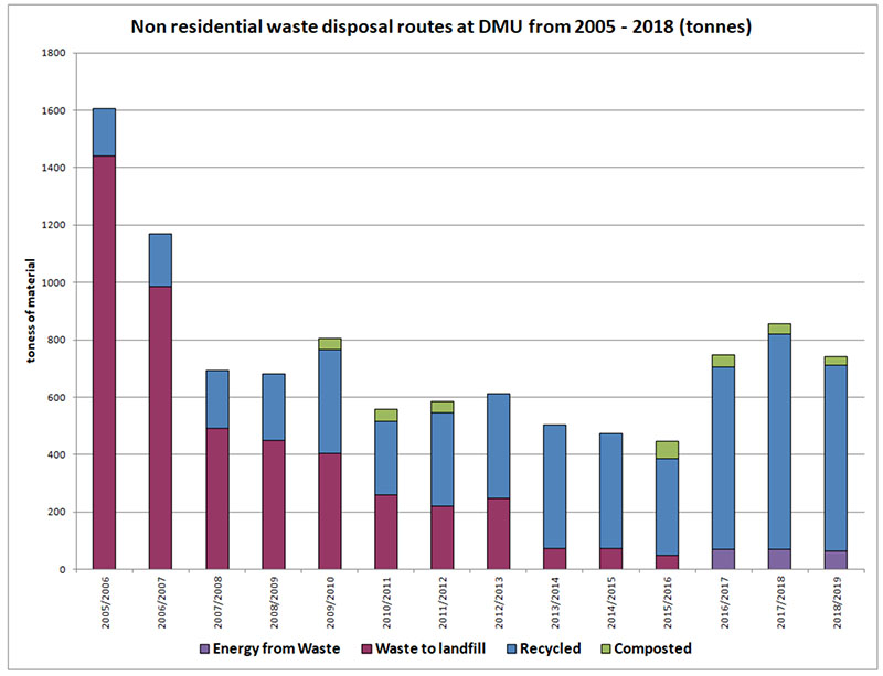 Image description: A bar chart displays non-residential waste disposal methods at DMU from 2005 to 2018, measured in tonnes. Four methods are shown: Energy from Waste (blue), Waste to Landfill (red), Recycled (green), and Composted (yellow). Over the years, Waste to Landfill decreases, while Energy from Waste becomes more prominent. Recycling and Composting show slight increases,