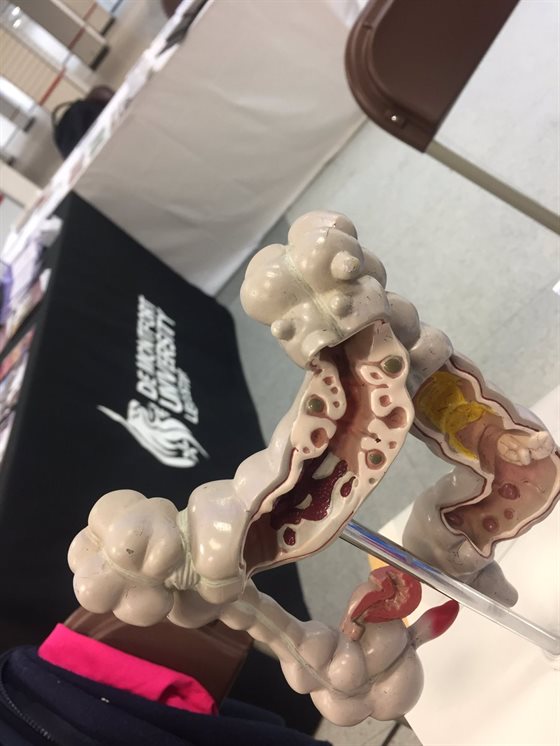 Volunteers from De Montfort University Leicester (DMU) have helped healthcare professionals teach hundreds of people about the dangers of bowel cancer.